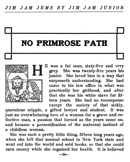 The story entitled "No Primrose Path" (February 1913) is a scathing indictment of patriarchal hypocrisy, a recurring theme in Jim Jam Jems.