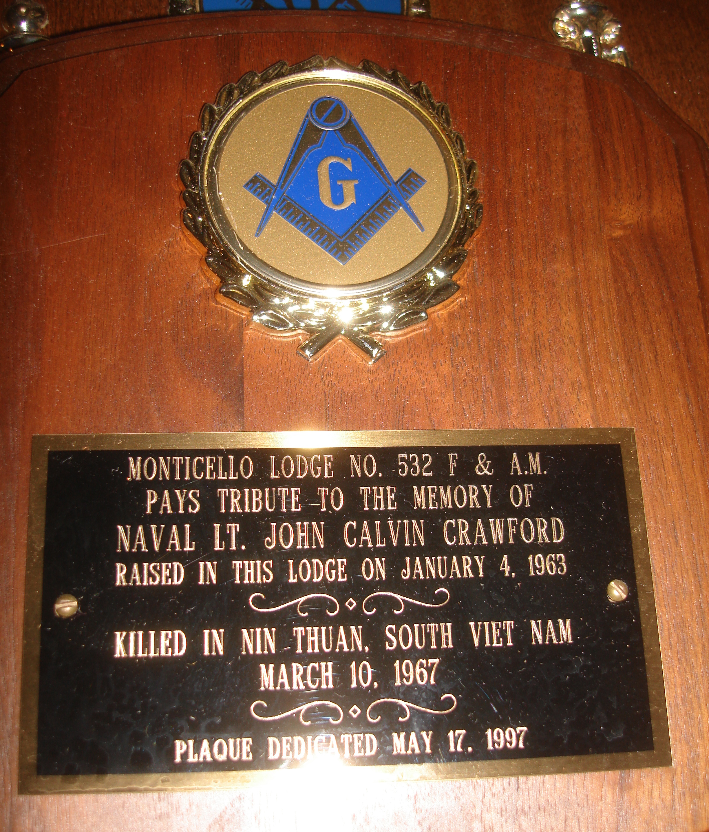 Plaque in lodge hall in memory of Lt. John C. Crawford